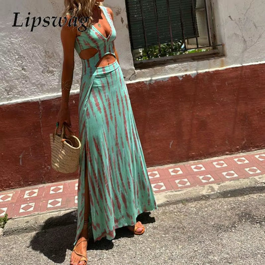 Elegant Sleeveless Split Long Dress for Women – High Waist, Hollow Out, Printed Party & Vacation Dress